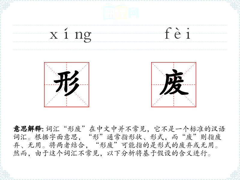 词汇“形废”在中文中并不常见,它不是一个标准的汉语词汇。根据字面意思,“形”通常指形状、形式,而“废”则指废弃、无用。将两者结合,“形废”可能指的是形式的废弃或无用。然而,由于这个词汇不常见,以下分析将基于假设的含义进行。