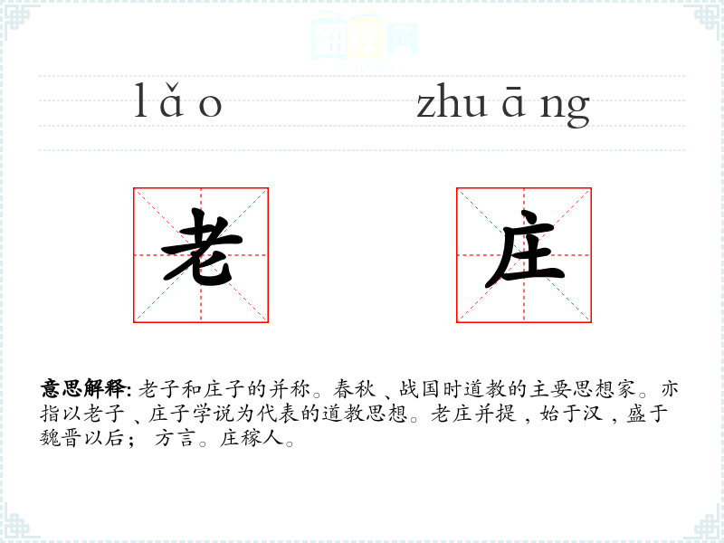 老子和庄子的并称。春秋﹑战国时道教的主要思想家。亦指以老子﹑庄子学说为代表的道教思想。老庄并提﹐始于汉﹐盛于魏晋以后; 方言。庄稼人。