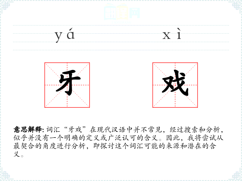 由于“牙戏”不是一个标准词汇,我们无法给出一个确切的字面意思和基本含义。但从字面上看,“牙”通常指牙齿,而“戏”可以指戏剧、游戏或某种表演。因此,“牙戏”可能指的是与牙齿相关的某种表演或活动。