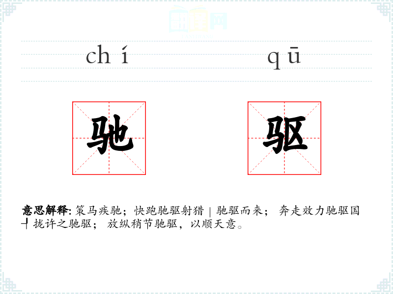 策马疾驰;快跑驰驱射猎|驰驱而来; 奔走效力驰驱国┦拢许之驰驱; 放纵稍节驰驱,以顺天意。