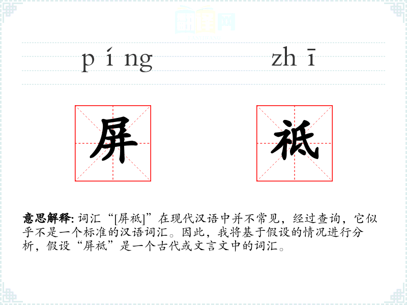 词汇“[屏祗]”在现代汉语中并不常见,经过查询,它似乎不是一个标准的汉语词汇。因此,我将基于假设的情况进行分析,假设“屏祗”是一个古代或文言文中的词汇。