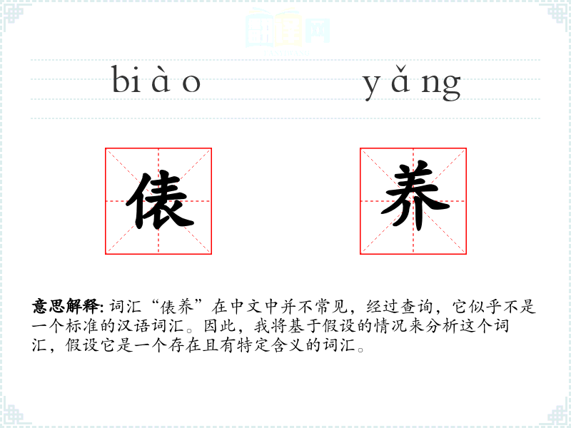 词汇“俵养”在中文中并不常见,经过查询,它似乎不是一个标准的汉语词汇。因此,我将基于假设的情况来分析这个词汇,假设它是一个存在且有特定含义的词汇。