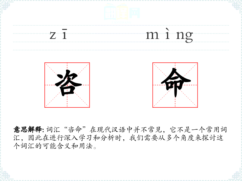 词汇“咨命”在现代汉语中并不常见,它不是一个常用词汇,因此在进行深入学*和分析时,我们需要从多个角度来探讨这个词汇的可能含义和用法。