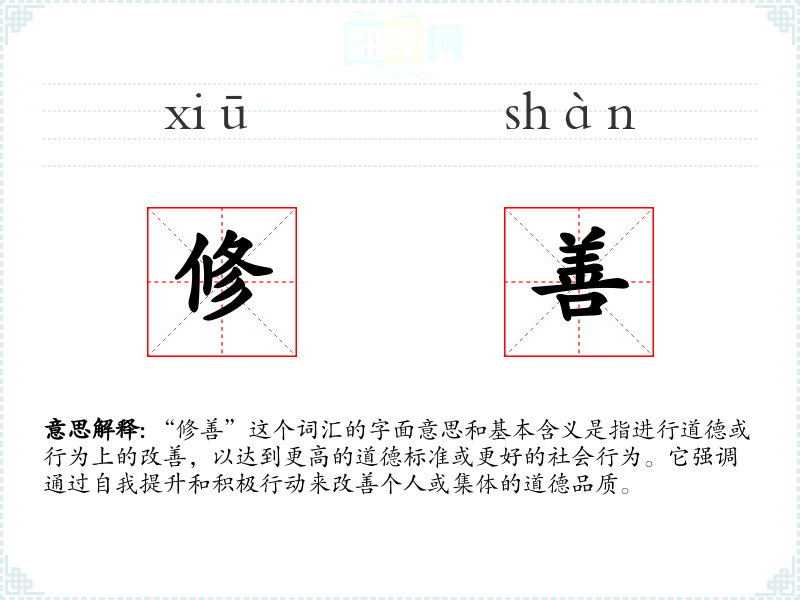 “修善”这个词汇的字面意思和基本含义是指进行道德或行为上的改善,以达到更高的道德标准或更好的社会行为。它强调通过自我提升和积极行动来改善个人或集体的道德品质。