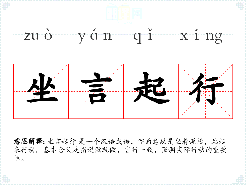 坐言起行 是一个汉语成语,字面意思是坐着说话,站起来行动。基本含义是指说做就做,言行一致,强调实际行动的重要性。