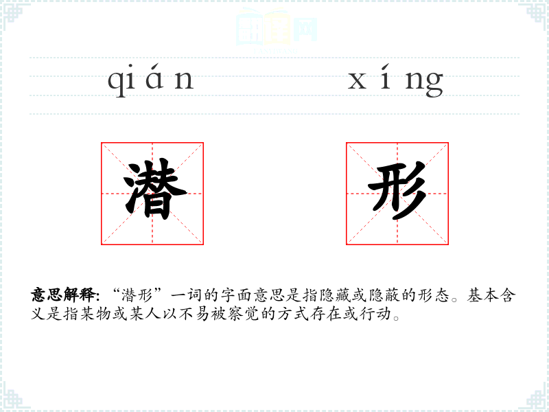 “潜形”一词的字面意思是指隐藏或隐蔽的形态。基本含义是指某物或某人以不易被察觉的方式存在或行动。
