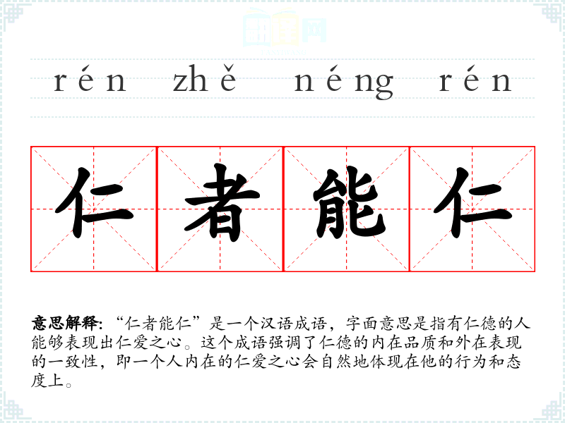 “仁者能仁”是一个汉语成语,字面意思是指有仁德的人能够表现出仁爱之心。这个成语强调了仁德的内在品质和外在表现的一致性,即一个人内在的仁爱之心会自然地体现在他的行为和态度上。