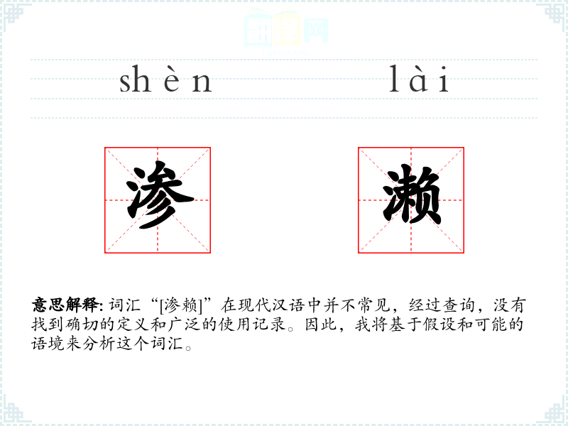 词汇“[渗赖]”在现代汉语中并不常见,经过查询,没有找到确切的定义和广泛的使用记录。因此,我将基于假设和可能的语境来分析这个词汇。