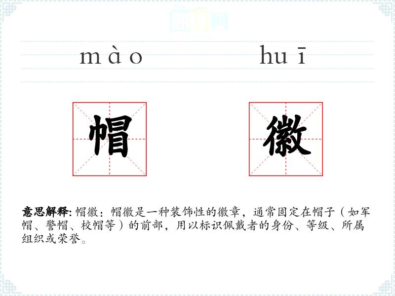 - 反义词:无(帽徽本身是一个具体的物品,没有直接的反义词)