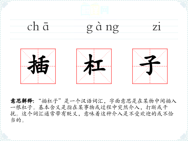 “插杠子”是一个汉语词汇,字面意思是在某物中间插入一根杠子。基本含义是指在某事物或过程中突然介入,打断或干扰。这个词汇通常带有贬义,意味着这种介入是不受欢迎的或不恰当的。