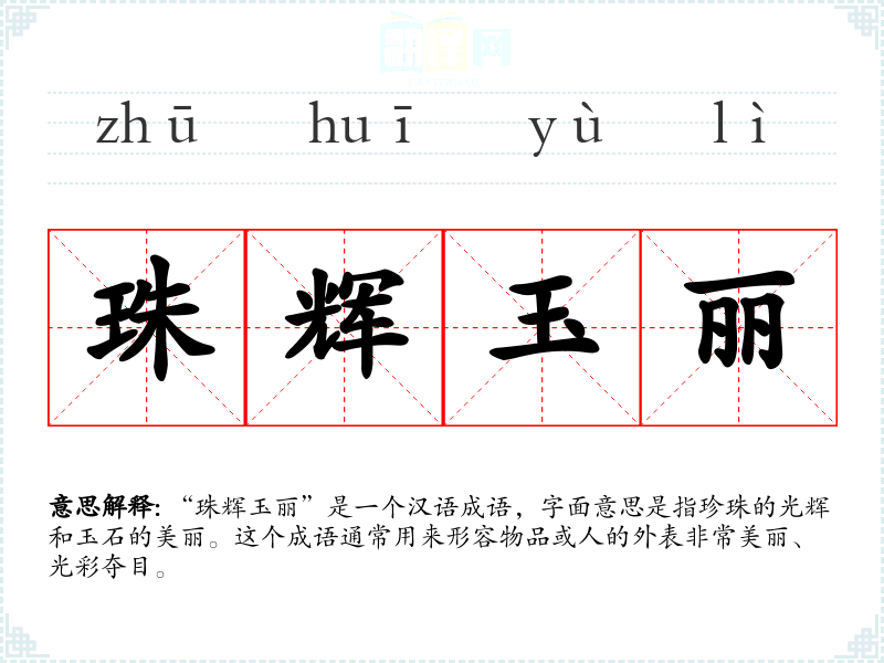 “珠辉玉丽”是一个汉语成语,字面意思是指珍珠的光辉和玉石的美丽。这个成语通常用来形容物品或人的外表非常美丽、光彩夺目。