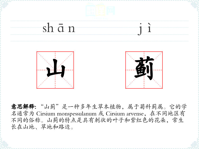 - 同义词:蓟草、刺蓟(都指同一类植物,但“山蓟”更强调其生长环境)