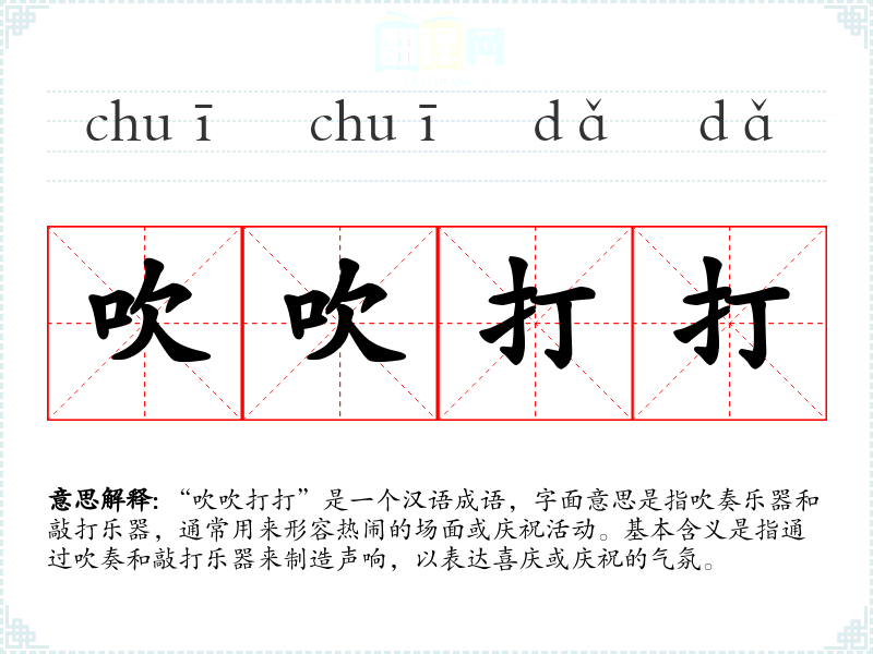 “吹吹打打”是一个汉语成语,字面意思是指吹奏乐器和敲打乐器,通常用来形容热闹的场面或庆祝活动。基本含义是指通过吹奏和敲打乐器来制造声响,以表达喜庆或庆祝的气氛。