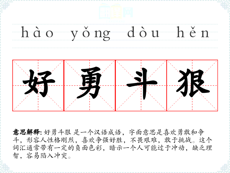 好勇斗狠 是一个汉语成语,字面意思是喜欢勇敢和争斗,形容人性格刚烈,喜欢争强好胜,不畏艰难,敢于挑战。这个词汇通常带有一定的负面色彩,暗示一个人可能过于冲动,缺乏理智,容易陷入冲突。