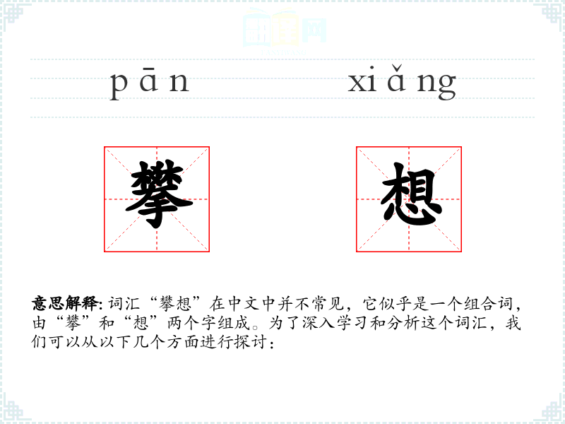 词汇“攀想”在中文中并不常见,它似乎是一个组合词,由“攀”和“想”两个字组成。为了深入学习和分析这个词汇,我们可以从以下几个方面进行探讨: