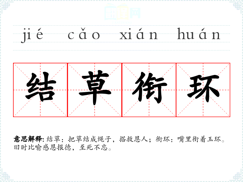 结草:把草结成绳子,搭救恩人;衔环:嘴里衔着玉环。旧时比喻感恩报德,至死不忘。