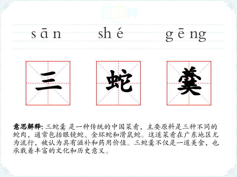 同义词:蛇羹(更广泛的术语,不特指三种蛇) 反义词:无特定反义词,但可以对比其他类型的汤或菜肴。