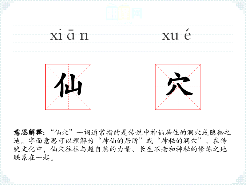 “仙穴”一词通常指的是传说中神仙居住的洞穴或隐秘之地。字面意思可以理解为“神仙的居所”或“神秘的洞穴”。在传统文化中,仙穴往往与超自然的力量、长生不老和神秘的修炼之地联系在一起。
