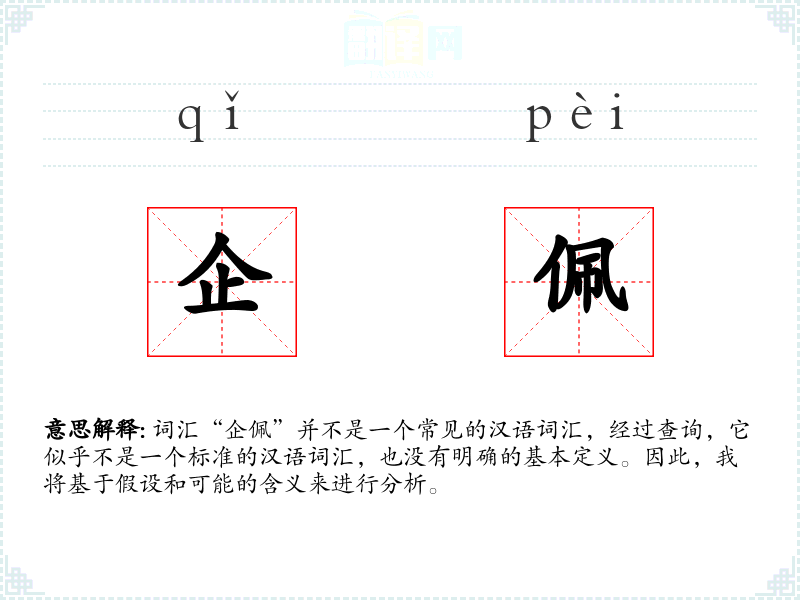 由于“企佩”不是一个标准的汉语词汇,我们无法给出一个确切的基本定义。如果假设它是由“企”和“佩”两个字组合而成,我们可以推测: