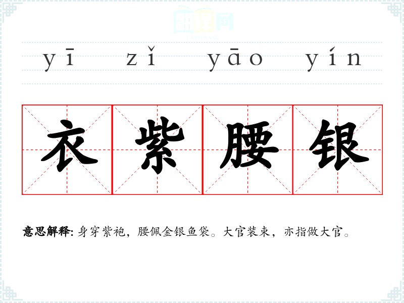 身穿紫袍,腰佩金银鱼袋。大官装束,亦指做大官。