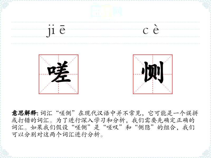 词汇“嗟侧”在现代汉语中并不常见,它可能是一个误拼或打错的词汇。为了进行深入学*和分析,我们需要先确定正确的词汇。如果我们假设“嗟侧”是“嗟叹”和“侧隐”的组合,我们可以分别对这两个词汇进行分析。