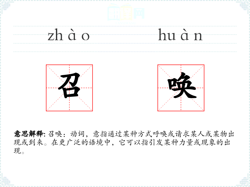 召唤:动词,意指通过某种方式呼唤或请求某人或某物出现或到来。在更广泛的语境中,它可以指引发某种力量或现象的出现。