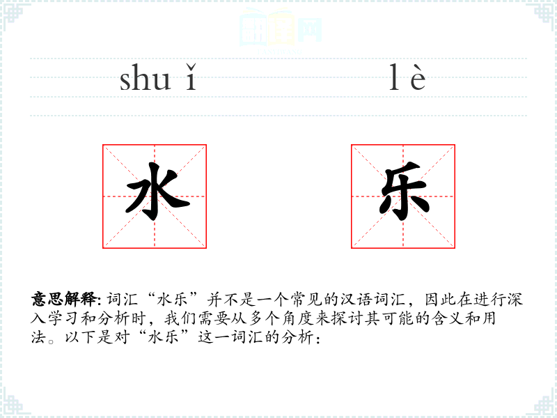 “水乐”字面意思可能是指与水相关的音乐或娱乐活动。然而,由于这是一个不常见的词汇,其确切含义可能需要结合具体语境来确定。