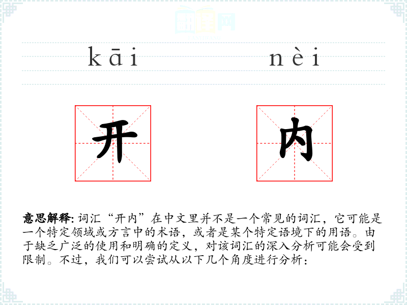 由于“开内”不是一个标准的中文词汇,我们无法提供一个确切的基本定义。它可能是某个行业术语,或者是某个地方方言中的表达。