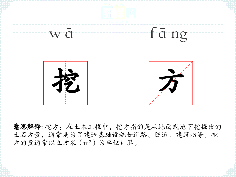 挖方:在土木工程中,挖方指的是从地面或地下挖掘出的土石方量,通常是为了建造基础设施如道路、隧道、建筑物等。挖方的量通常以立方米(m³)为单位计算。
