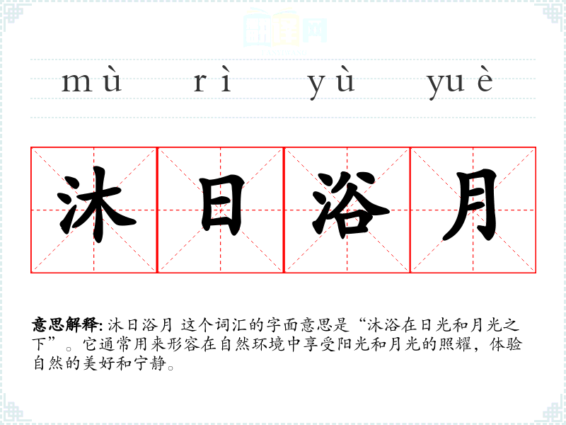 沐日浴月 这个词汇的字面意思是“沐浴在日光和月光之下”。它通常用来形容在自然环境中享受阳光和月光的照耀,体验自然的美好和宁静。