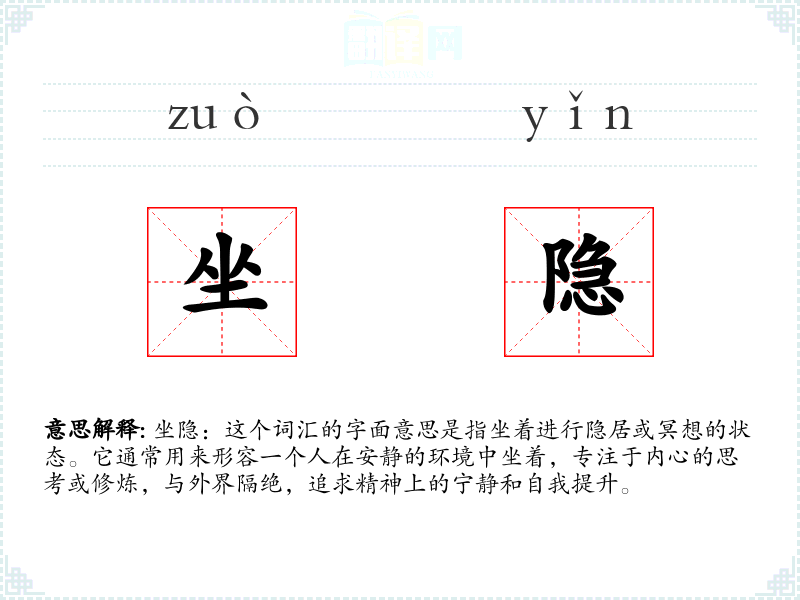 坐隐:这个词汇的字面意思是指坐着进行隐居或冥想的状态。它通常用来形容一个人在安静的环境中坐着,专注于内心的思考或修炼,与外界隔绝,追求精神上的宁静和自我提升。