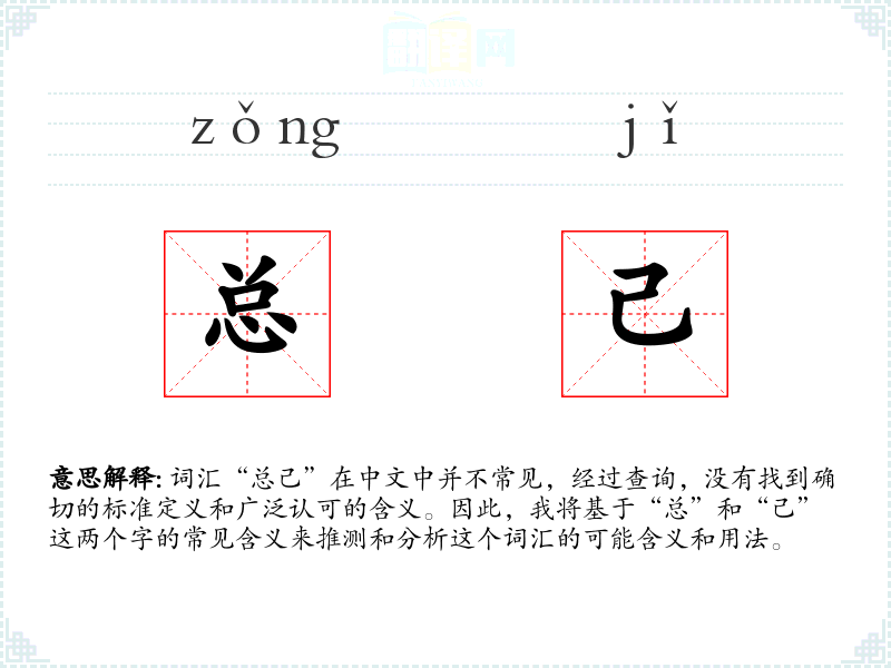 词汇“总己”在中文中并不常见,经过查询,没有找到确切的标准定义和广泛认可的含义。因此,我将基于“总”和“己”这两个字的常见含义来推测和分析这个词汇的可能含义和用法。