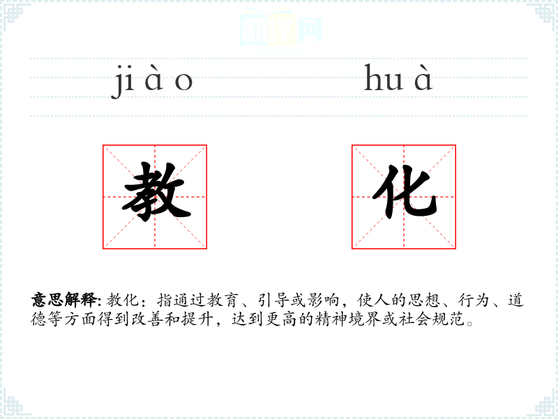 教化:指通过教育、引导或影响,使人的思想、行为、道德等方面得到改善和提升,达到更高的精神境界或社会规范。