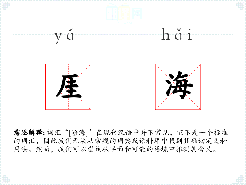 词汇“[崄海]”在现代汉语中并不常见,它不是一个标准的词汇,因此我们无法从常规的词典或语料库中找到其确切定义和用法。然而,我们可以尝试从字面和可能的语境中推测其含义。