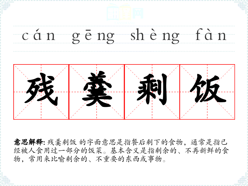 残羹剩饭 的字面意思是指餐后剩下的食物,通常是指已经被人食用过一部分的饭菜。基本含义是指剩余的、不再新鲜的食物,常用来比喻剩余的、不重要的东西或事物。