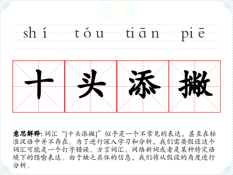 词汇“[十头添撇]”似乎是一个不常见的表达,甚至在标准汉语中并不存在。为了进行深入学习和分析,我们需要假设这个词汇可能是一个打字错误、方言词汇、网络新词或者是某种特定语境下的隐喻表达。由于缺乏具体的信息,我们将从假设的角度进行分析。