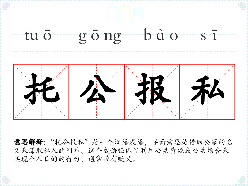 在日常生活中,我们可能会遇到或听说某些人利用职务之便为自己或亲友谋取不正当利益的情况,这时就可以使用“托公报私”这个成语来描述这种行为。