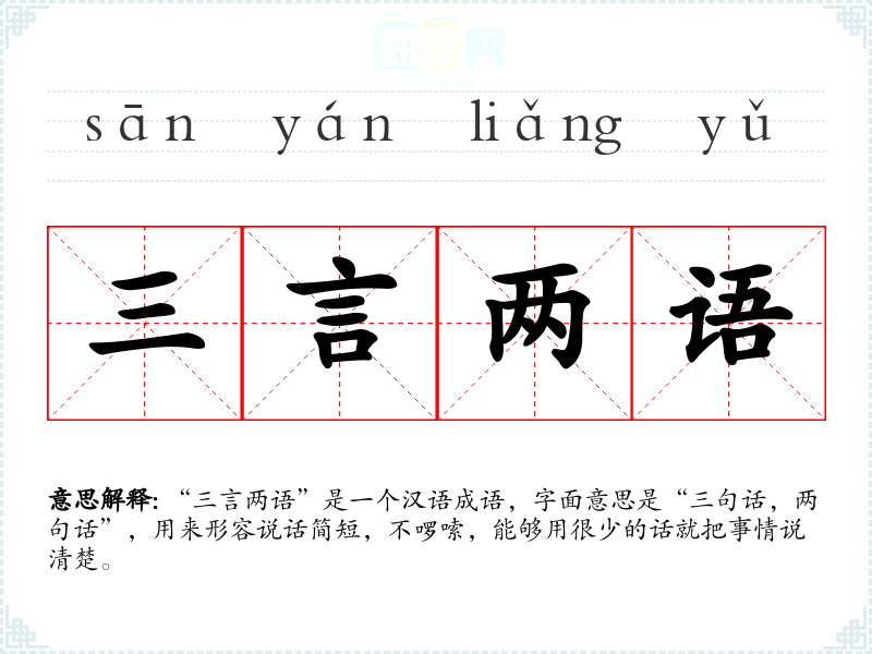 “三言两语”是一个汉语成语,字面意思是“三句话,两句话”,用来形容说话简短,不啰嗦,能够用很少的话就把事情说清楚。