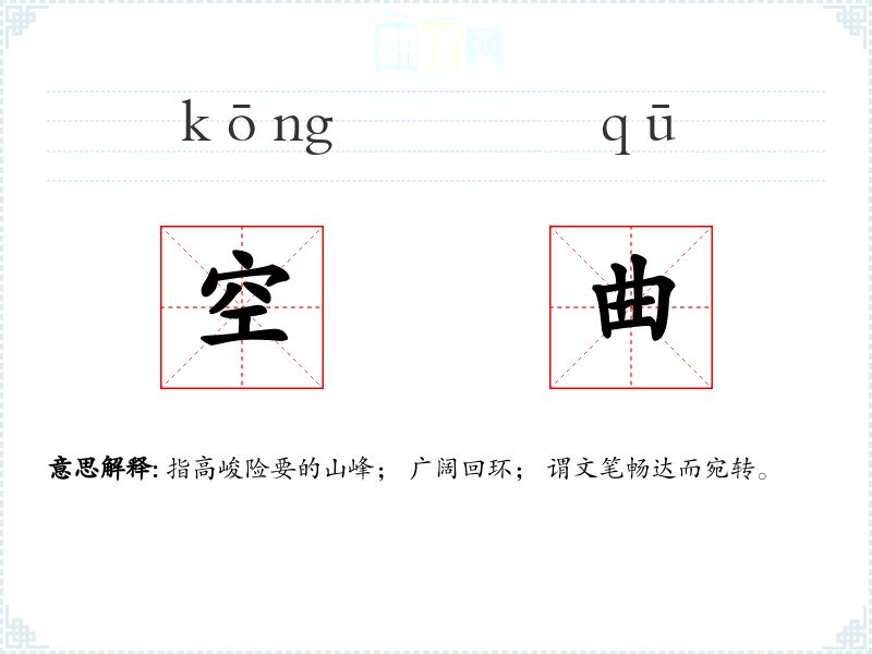 指高峻险要的山峰; 广阔回环; 谓文笔畅达而宛转。