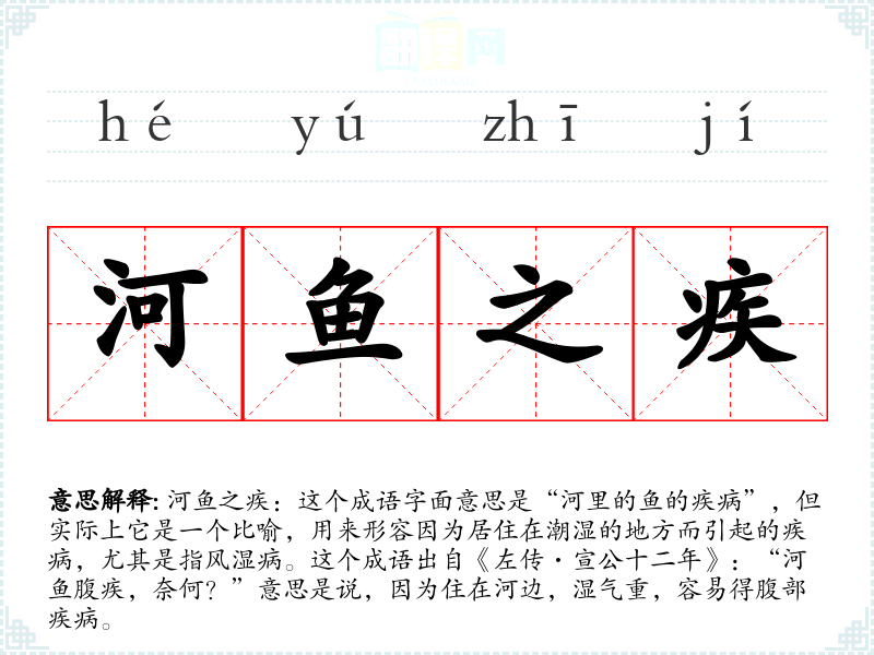 河鱼之疾:这个成语字面意思是“河里的鱼的疾病”,但实际上它是一个比喻,用来形容因为居住在潮湿的地方而引起的疾病,尤其是指风湿病。这个成语出自《左传·宣公十二年》:“河鱼腹疾,奈何?”意思是说,因为住在河边,湿气重,容易得腹部疾病。