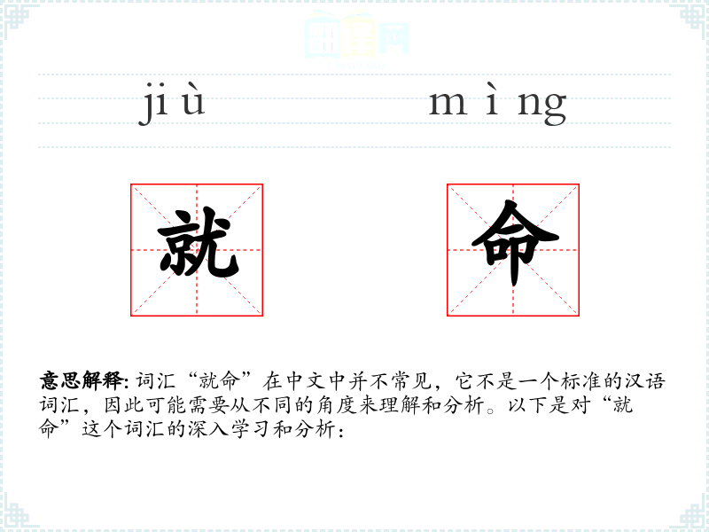 词汇“就命”在中文中并不常见,它不是一个标准的汉语词汇,因此可能需要从不同的角度来理解和分析。以下是对“就命”这个词汇的深入学习和分析:
