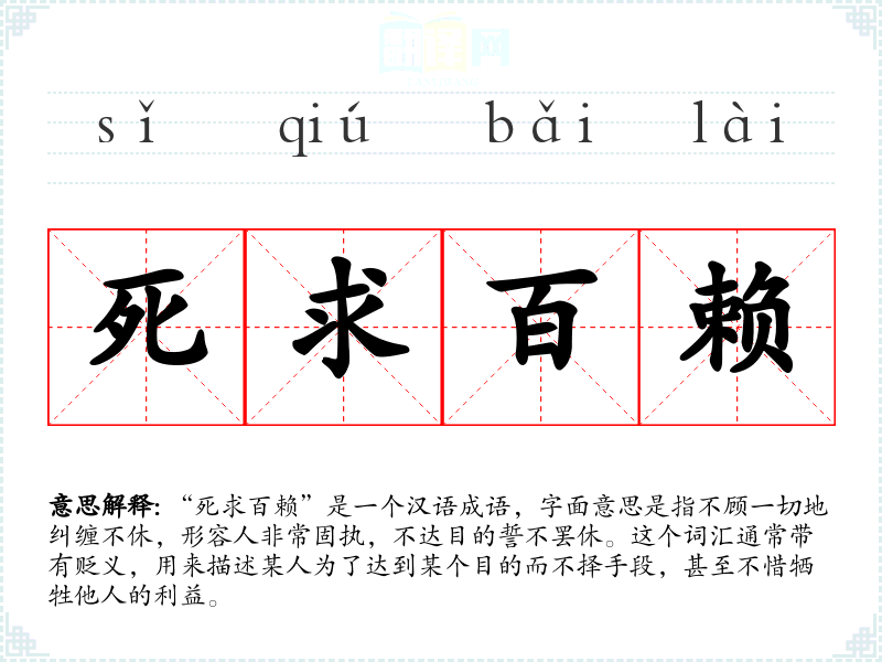 “死求百赖”是一个汉语成语,字面意思是指不顾一切地纠缠不休,形容人非常固执,不达目的誓不罢休。这个词汇通常带有贬义,用来描述某人为了达到某个目的而不择手段,甚至不惜牺牲他人的利益。