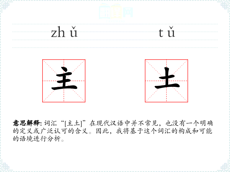 词汇“[主土]”在现代汉语中并不常见,也没有一个明确的定义或广泛认可的含义。因此,我将基于这个词汇的构成和可能的语境进行分析。