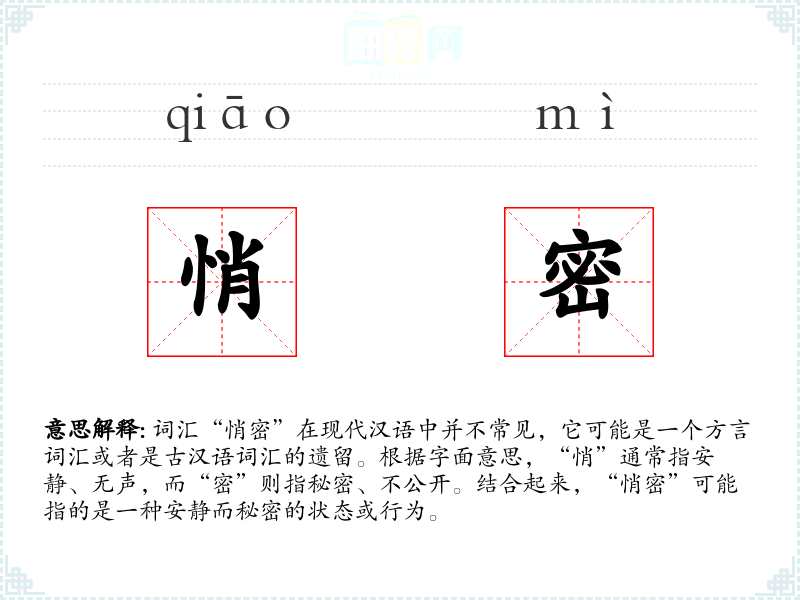 词汇“悄密”在现代汉语中并不常见,它可能是一个方言词汇或者是古汉语词汇的遗留。根据字面意思,“悄”通常指安静、无声,而“密”则指秘密、不公开。结合起来,“悄密”可能指的是一种安静而秘密的状态或行为。