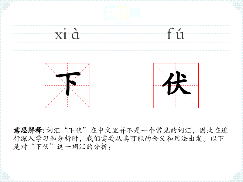 词汇“下伏”在中文里并不是一个常见的词汇,因此在进行深入学习和分析时,我们需要从其可能的含义和用法出发。以下是对“下伏”这一词汇的分析:
