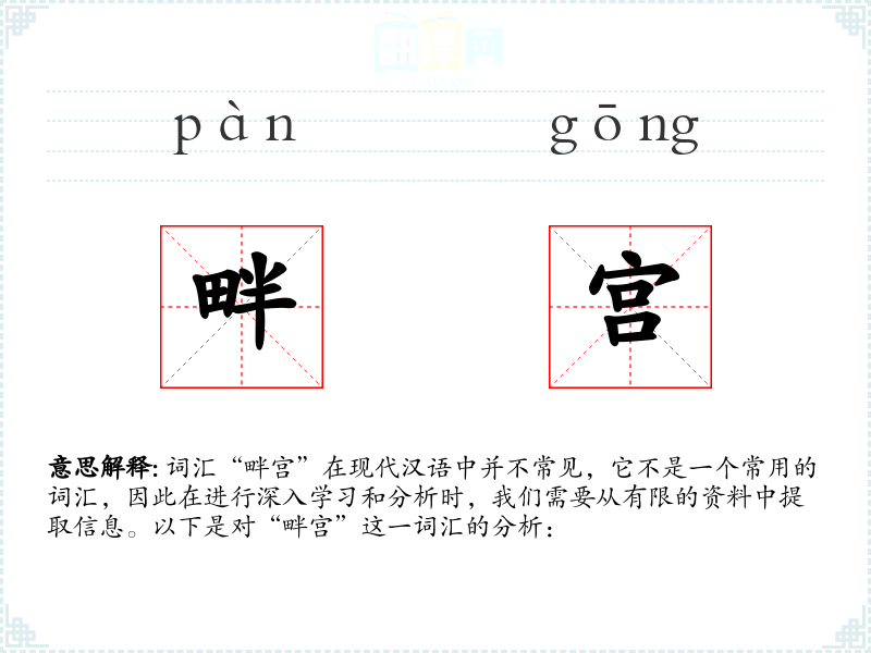 词汇“畔宫”在现代汉语中并不常见,它不是一个常用的词汇,因此在进行深入学*和分析时,我们需要从有限的资料中提取信息。以下是对“畔宫”这一词汇的分析: