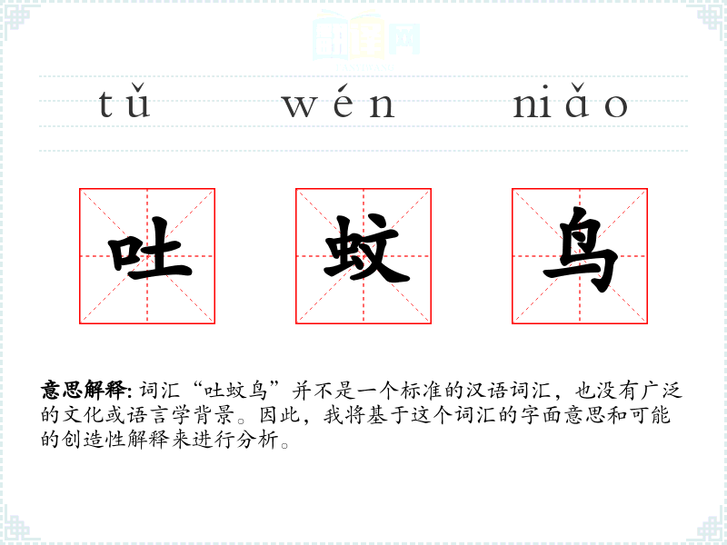 词汇“吐蚊鸟”并不是一个标准的汉语词汇,也没有广泛的文化或语言学背景。因此,我将基于这个词汇的字面意思和可能的创造性解释来进行分析。