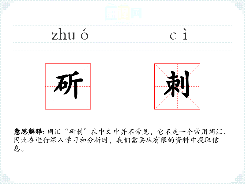 词汇“斫刺”在中文中并不常见,它不是一个常用词汇,因此在进行深入学*和分析时,我们需要从有限的资料中提取信息。