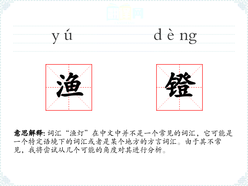 词汇“渔灯”在中文中并不是一个常见的词汇,它可能是一个特定语境下的词汇或者是某个地方的方言词汇。由于其不常见,我将尝试从几个可能的角度对其进行分析。