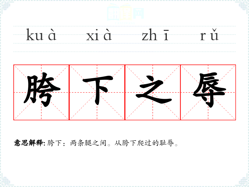 胯下:两条腿之间。从胯下爬过的耻辱。